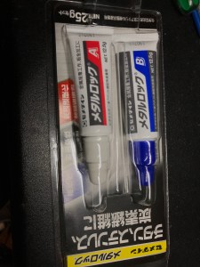 シャーレ機の作成時カーボンにべニアなどを接着するのに、脱脂して荒らしておいてもエポキシは意外とぽろっと取れてしまう事があるのでアクリル系接着剤、セメダインメタルロックがお勧めです。ゴルフクラブのカーボンシャフトとヘッドの接着にも使われているぐらいなので、ラジコンには十分以上の強度といえるでしょう。エポキシの様に2液混合、B剤が黒いので接着部が黒くなって若干見た目が悪いのと混ぜると3分ほどでゲル状に固まり始めるので作業時間が限られるのが注意点です。完全硬化には数時間かかります。最近車のボディパネルの接着に使われているのもこの系統のものです。接着強度の高さがうかがい知れます。