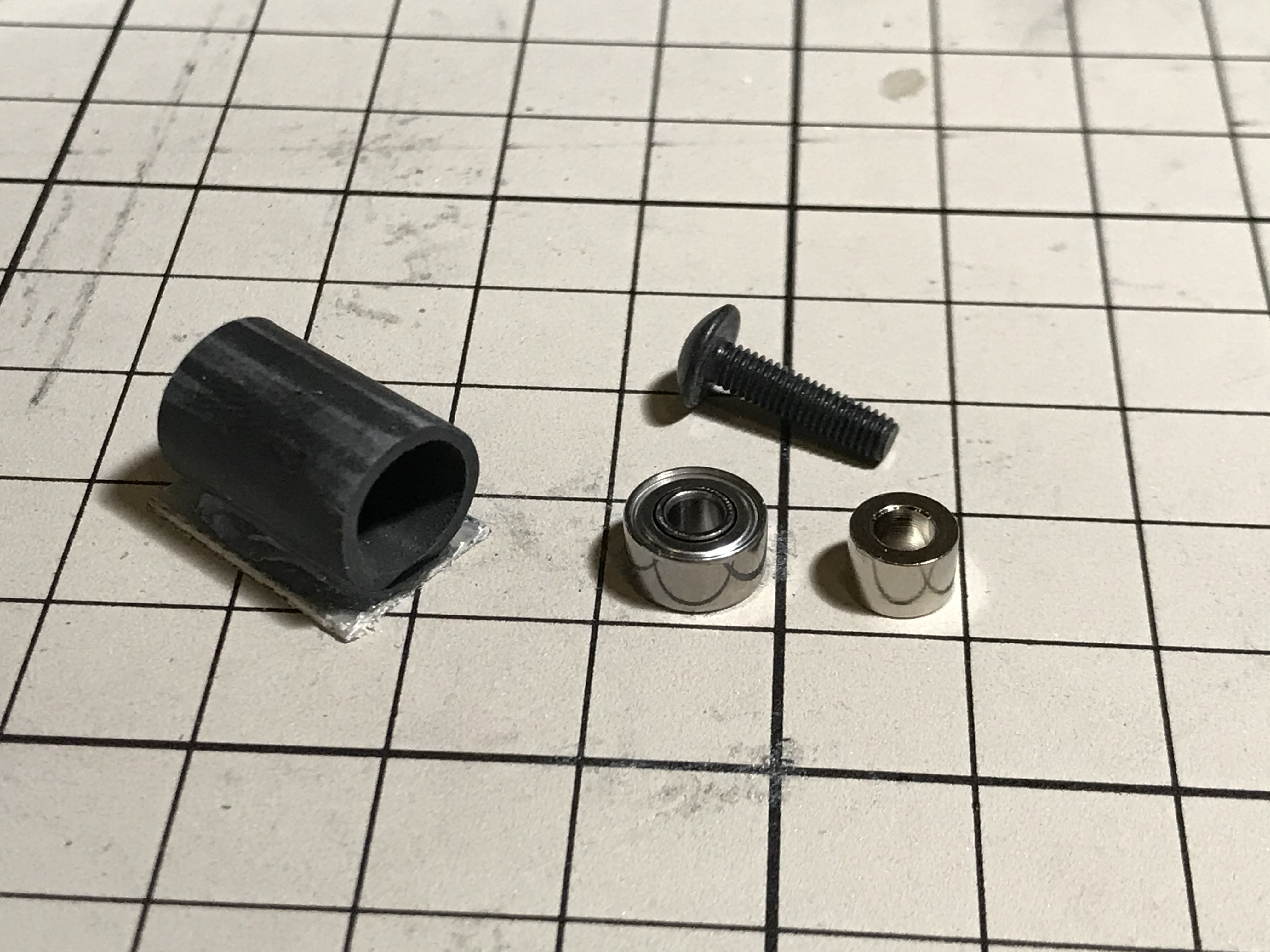 使用している材料は下の写真のものです。カーボンパイプ以外はすべてモノタロウ様で揃えました。カーボンパイプは外径10mm内径8mmのもの(KKホビー様)でも良く、この場合下駄は要らないのですが実際の内径は8mmよりちょっと太いのでベアリング受けに若干の遊びが出ます。写真の115HVその他Bluebirdのすべてのウイングサーボに応用できます。カーボンパイプは公称値程の精度が無い事も多いので物により9/7mmパイプにはBBが嵌らない可能性もあります。