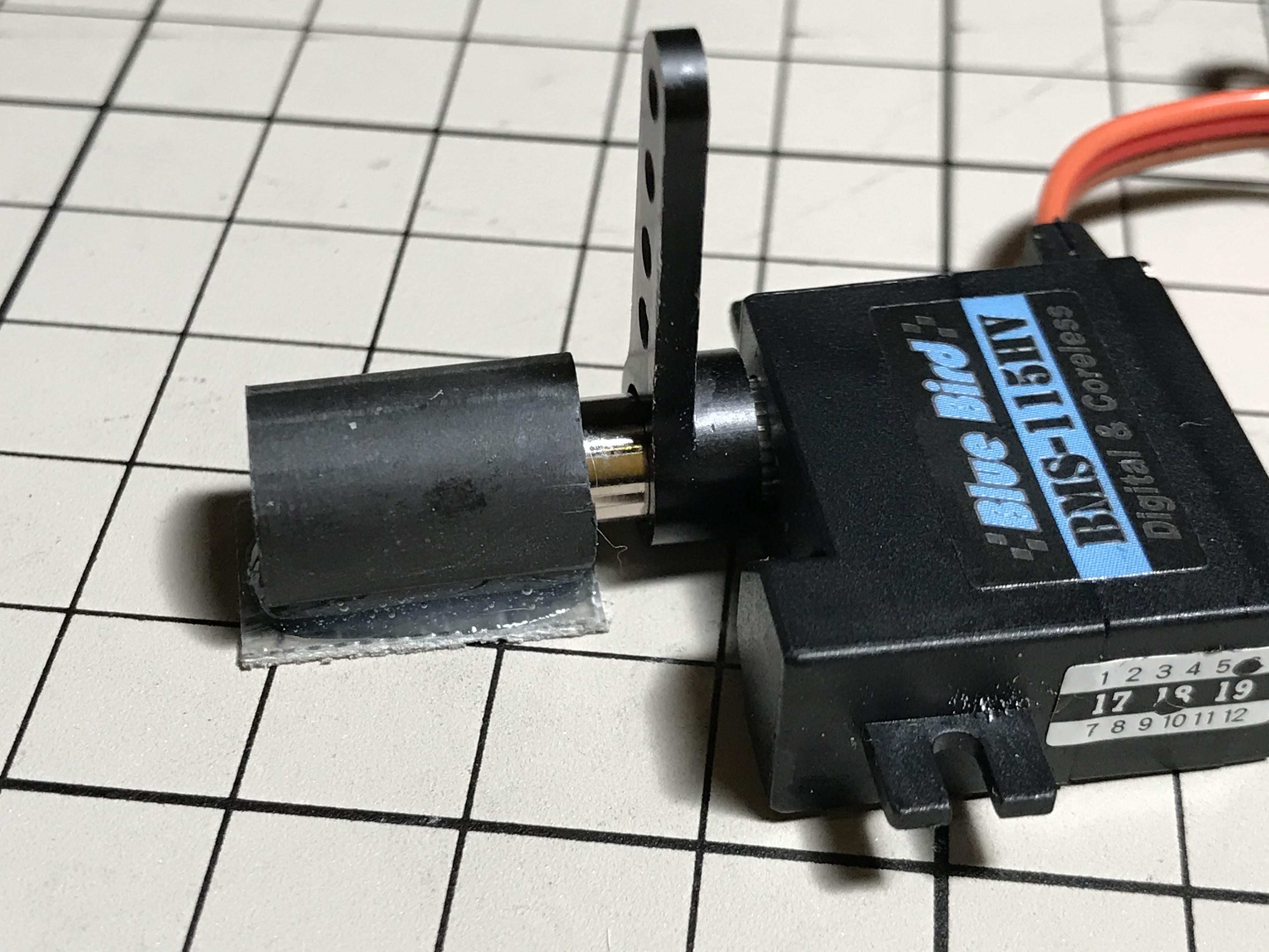 Bluebirdサーボはサーボホーン取り付けネジがM3と、他社より太くなっています。これを生かした厚み10mmウイングサーボ用カウンターベアリングシステムです。外径8mm、内径3mmのBB、内径3mmの真鍮メッキスペーサー、12mmのM3ステン黒色皿ネジと、ベアリング受けとしてカーボンパイプ使用。カーボンパイプは公称外径9mm内径7mm(サノファクトリー様)なのですが、内径が実際はきっちり8mmありベアリングがタイトにはまります。0.5mmGFプレートをあらかじめカーボンパイプに接着して下駄にします。ベアリング受けを嵌めた状態でサーボをサーボベッドに固定し、同時にベアリング受けは翼内面にエポキシで接着します。エポキシが完全に固まる前にサーボを数回動かして、ベアリング受けのセンターを出します。