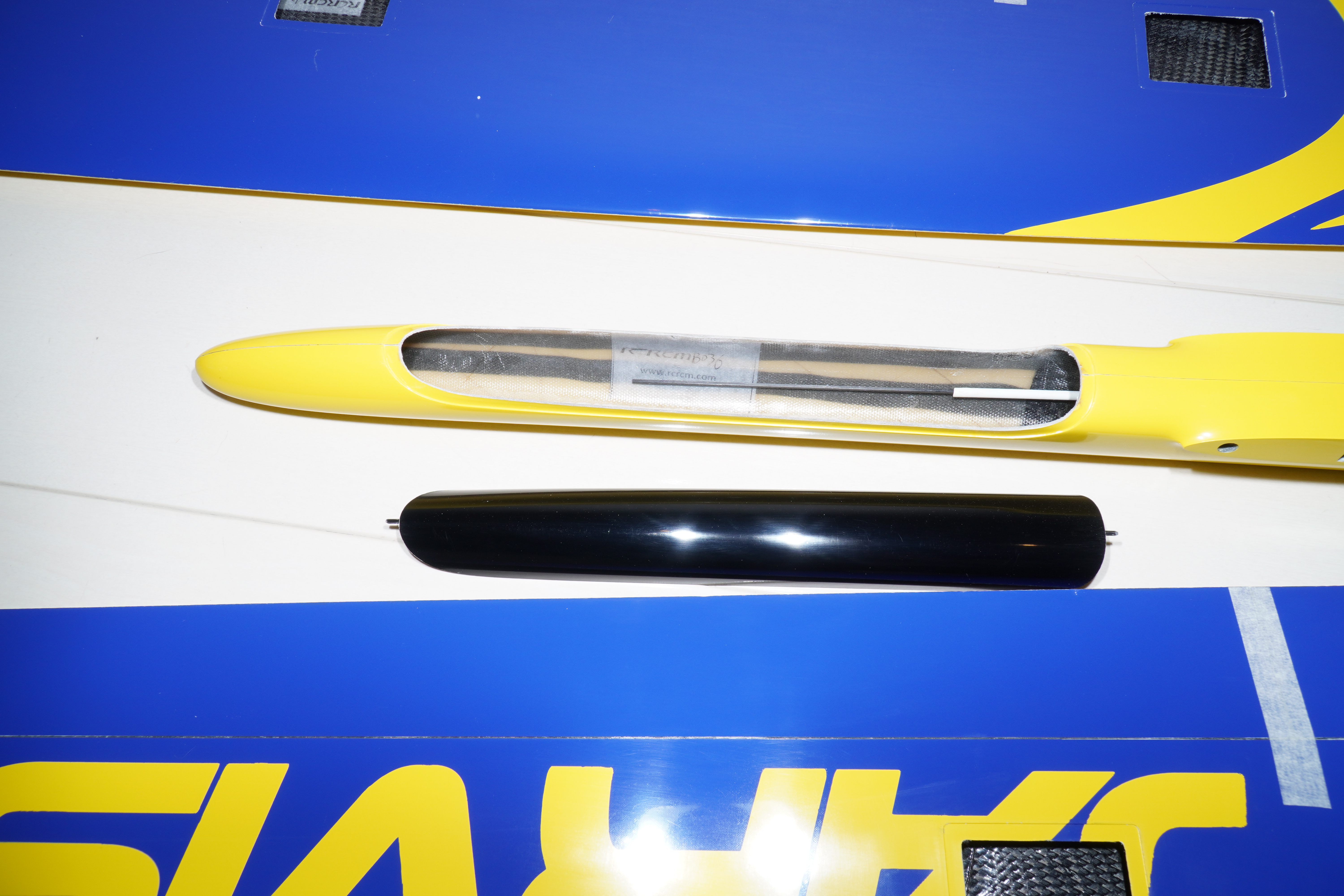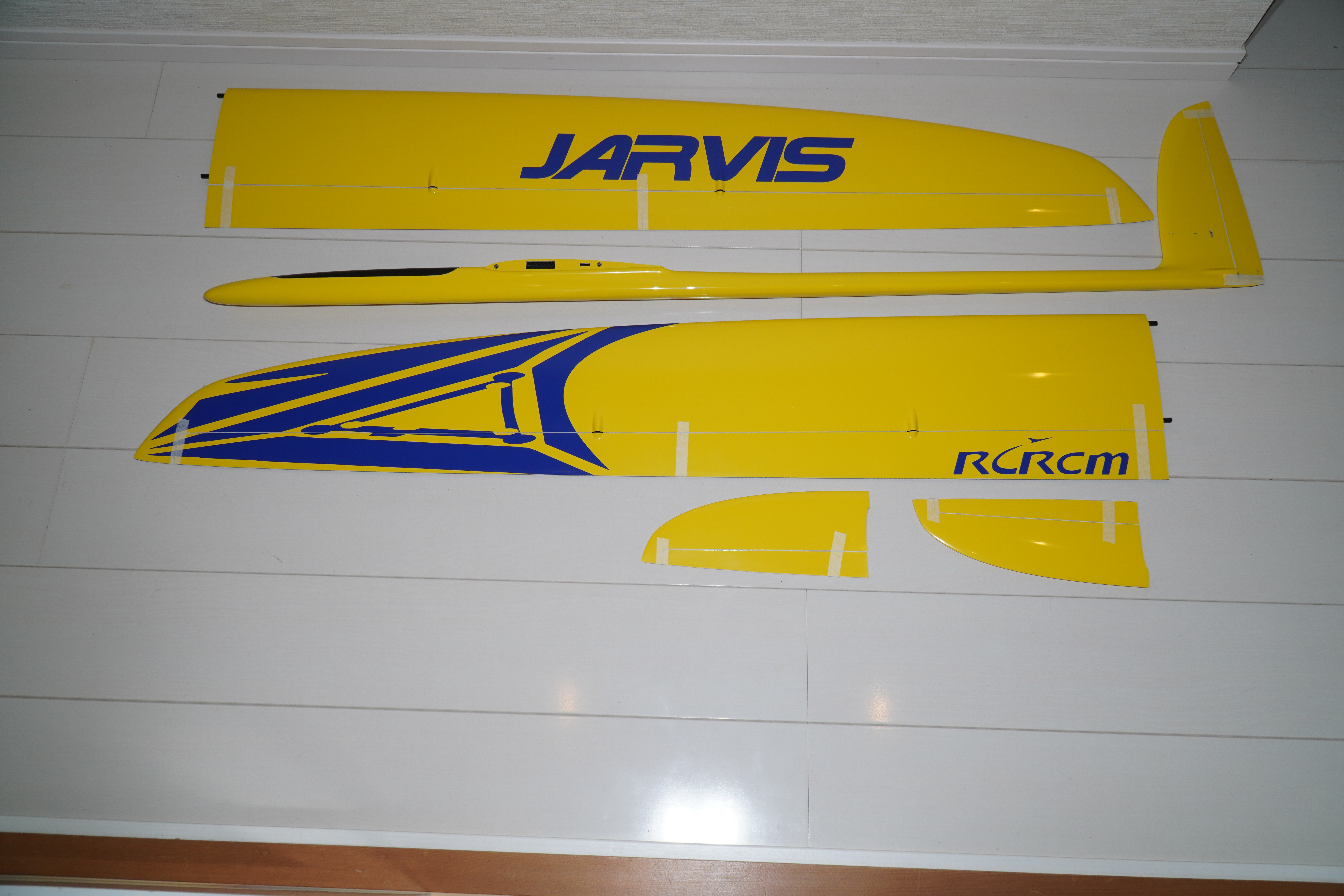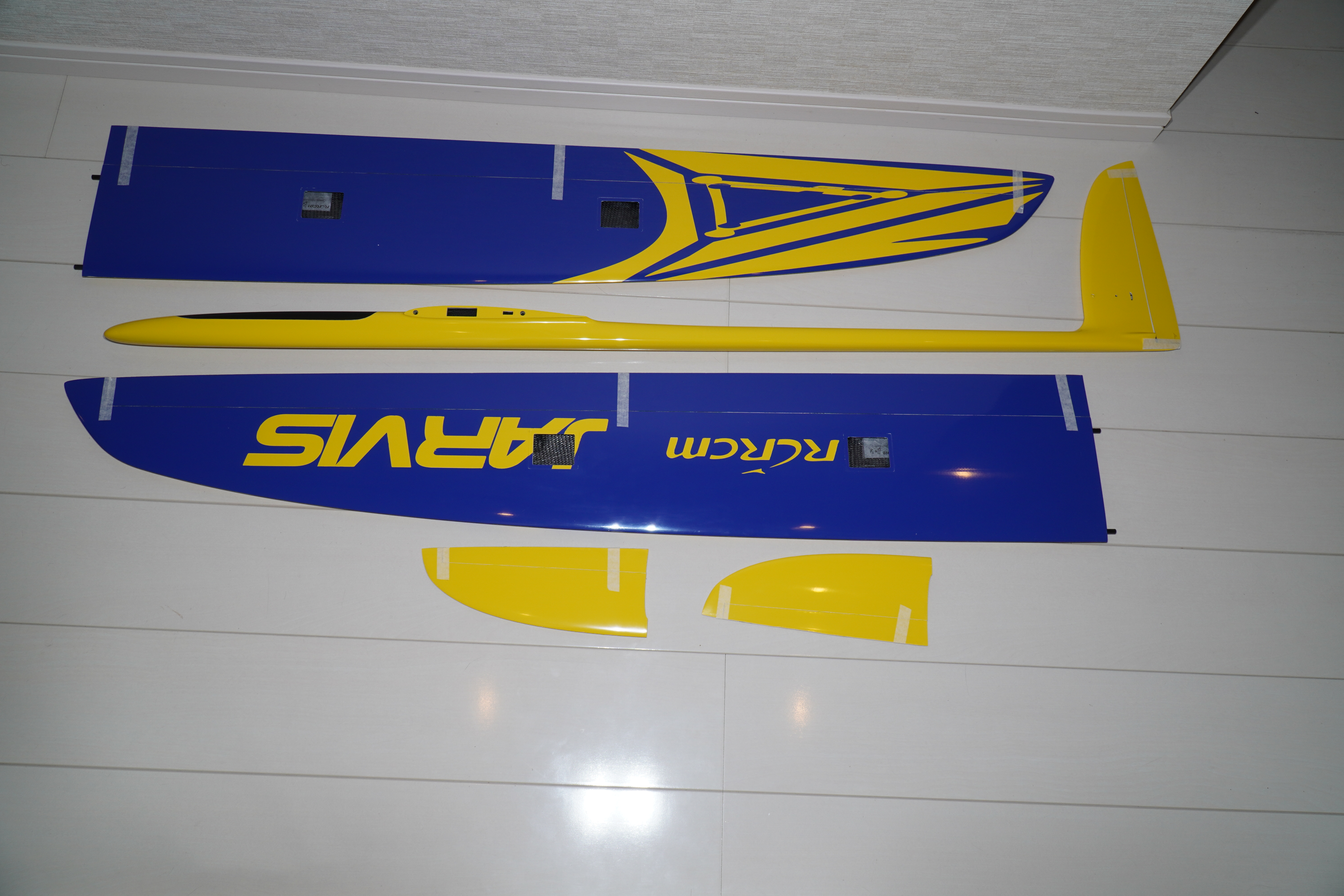 イエローベース青と、オレンジベース青の2機入荷しました。カーボンバージョンをベースに特注色、胴体後半部をKevlar強化しています。テールのリンケージは1.5mm角カーボンとアウターパイプの組み合わせですでに胴体内に接着されています。水平尾翼は通常の動翼タイプです。ベルクランクを介してリンケージされています。ノーズもV-tailバージョンのノーズコーン式からハッチに変わっています。全般にTomcat evoと同じ形式です。価格86,000円(税込み)となります。アルミ蒸着の機体カバー、主翼用のハーネス一式が付属します。オレンジ/青の機体は、写真の黄色の部分がオレンジになります。どちらも機体の裏表は見やすいと思います。Tomcat evoの方が少し価格がもともと高くなっていますが、発売時期の関係とTomcat evoでは主翼のメインスパーがカーボン補強されている辺りのコストの違いでしょうか。Jarvisの主翼もカーボンバージョンではスロープの飛行に全く問題ない強度があります。