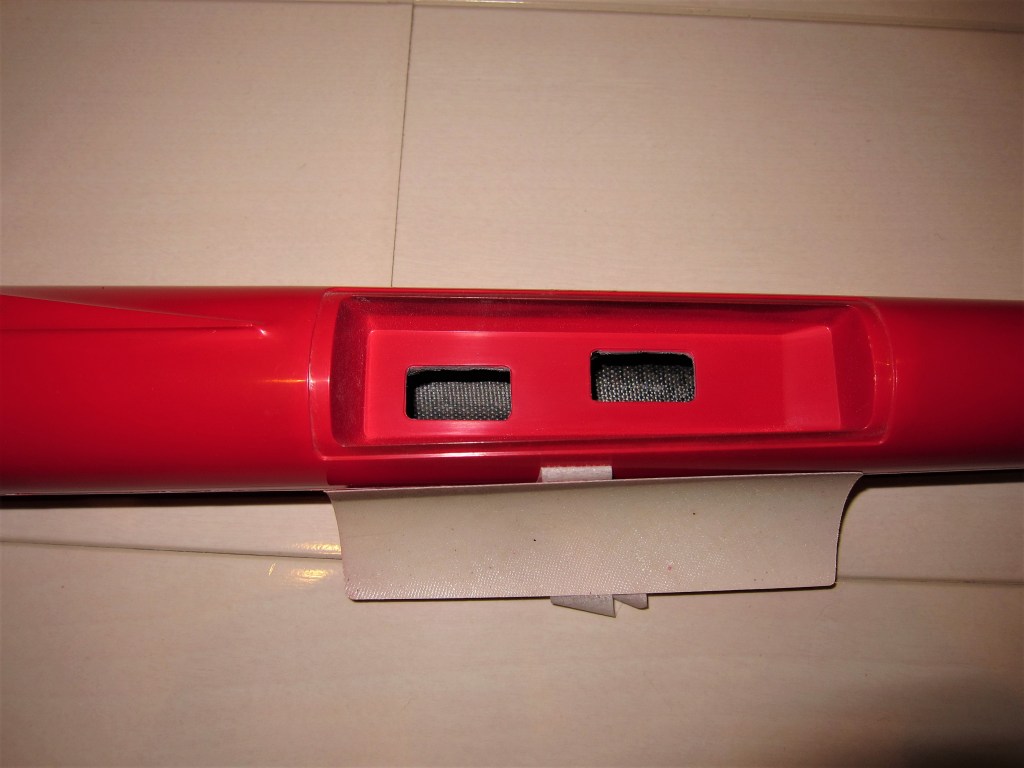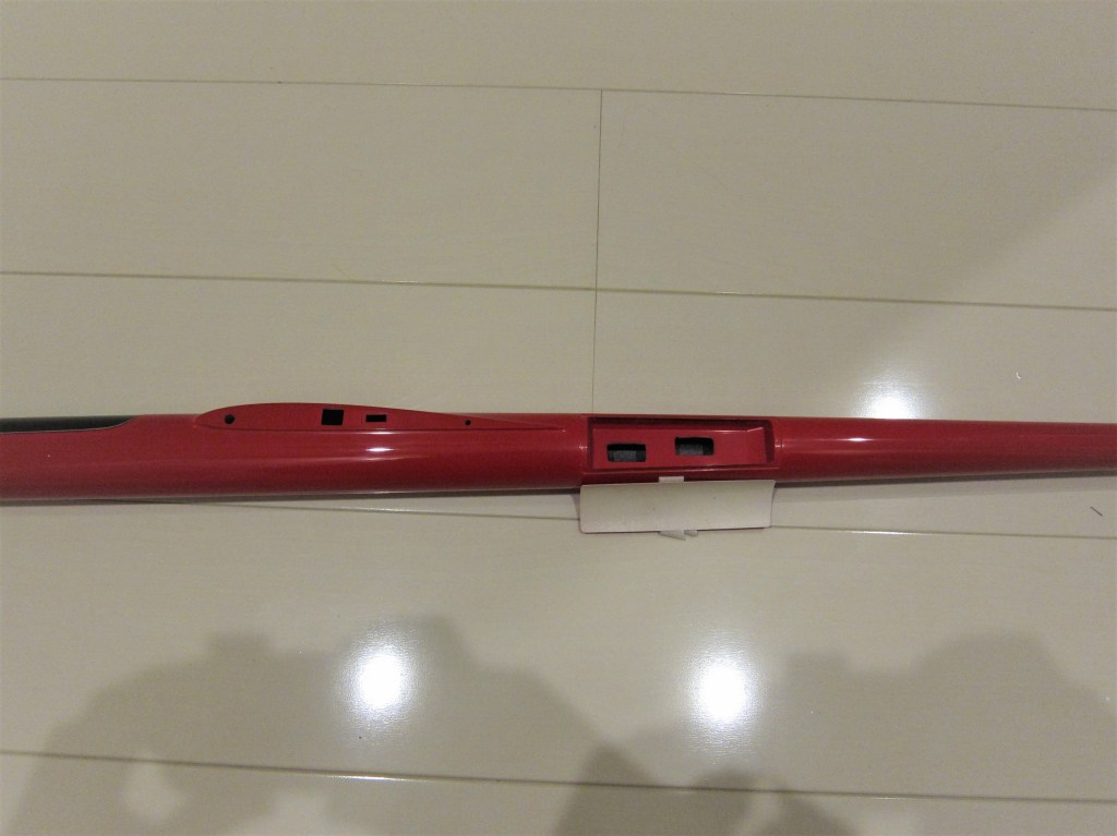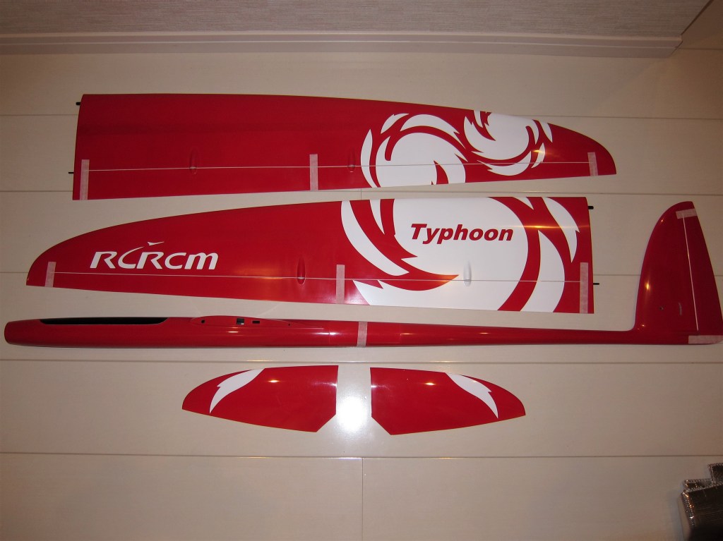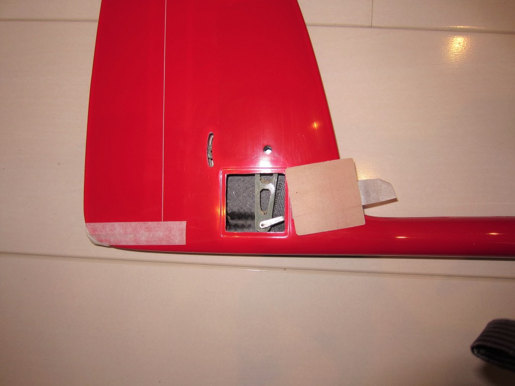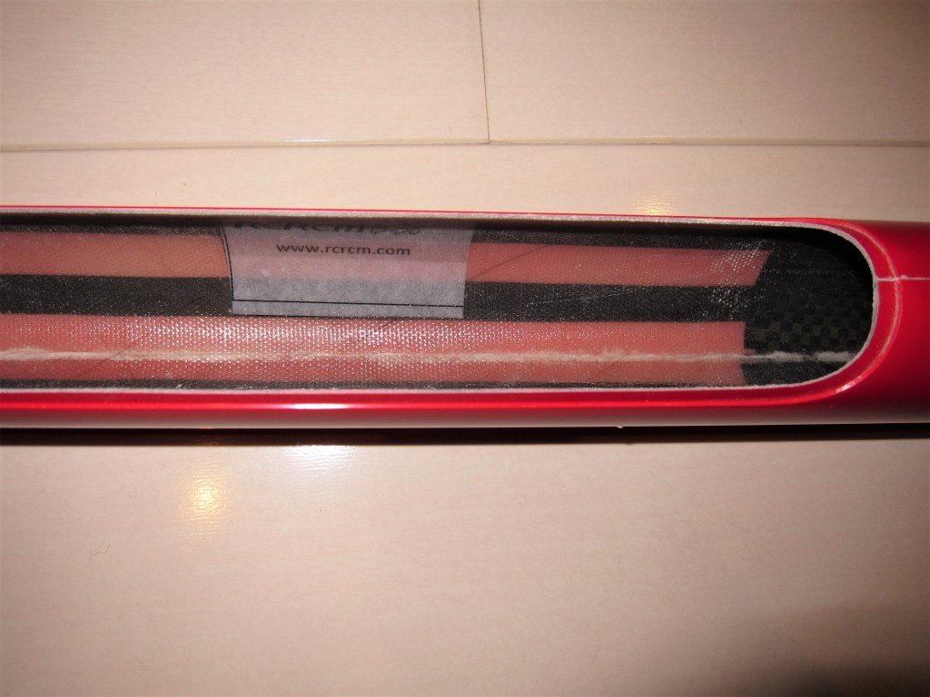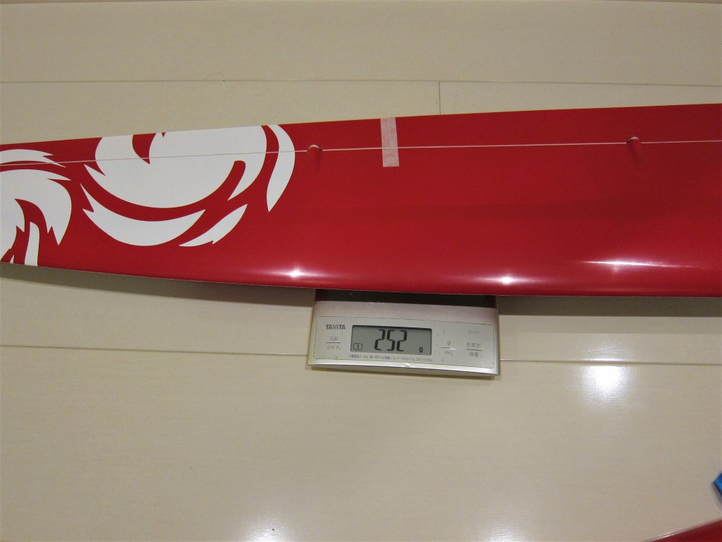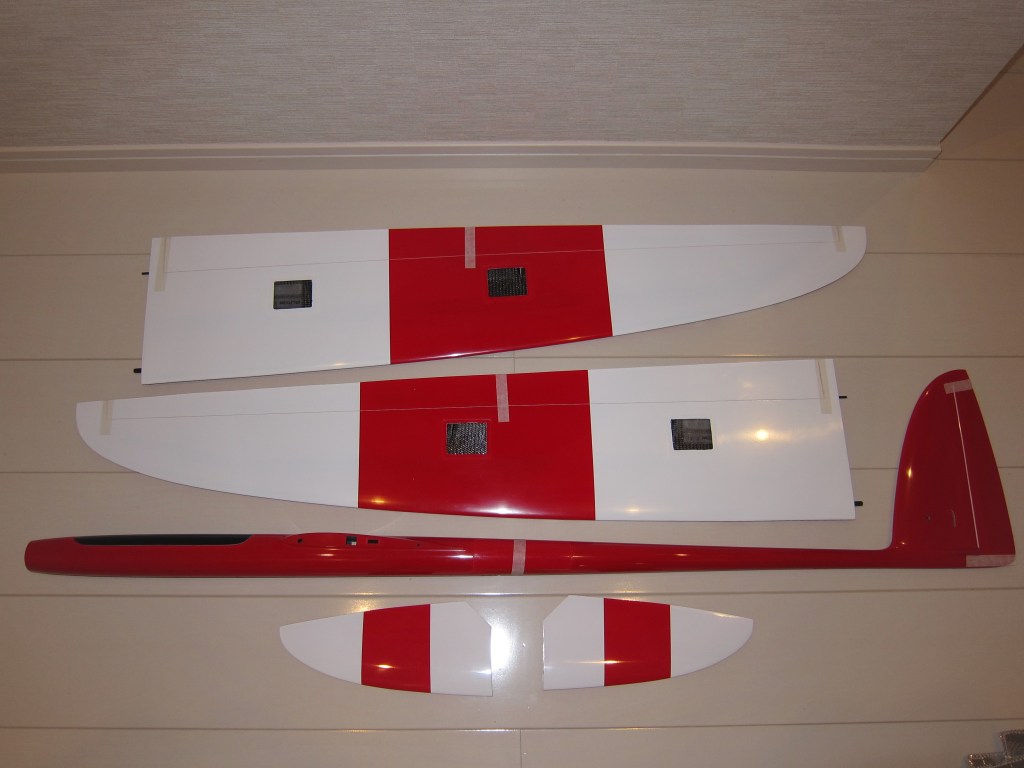 エレベータ、ラダーサーボの搭載方法はちょっと変わっています。主翼より後部左側の胴体にハッチがありここに搭載します。グラス仕様とは言っても胴体には写真の通りカーボンが多用されています。ノーズはグラスですが何本もカーボンロービングが入っています。エレベータのベルクランク部分にもハッチがあり周辺はカーボン補強されています。細かい部分もしっかり作られている印象です。胴体にはBMS125-WVがちょうどよさそうです。サーボベッドはすこし削りは要ると思います。標準色の黒い部分を白にしています。機体の裏表は赤黒よりもわかりやすいはずです。