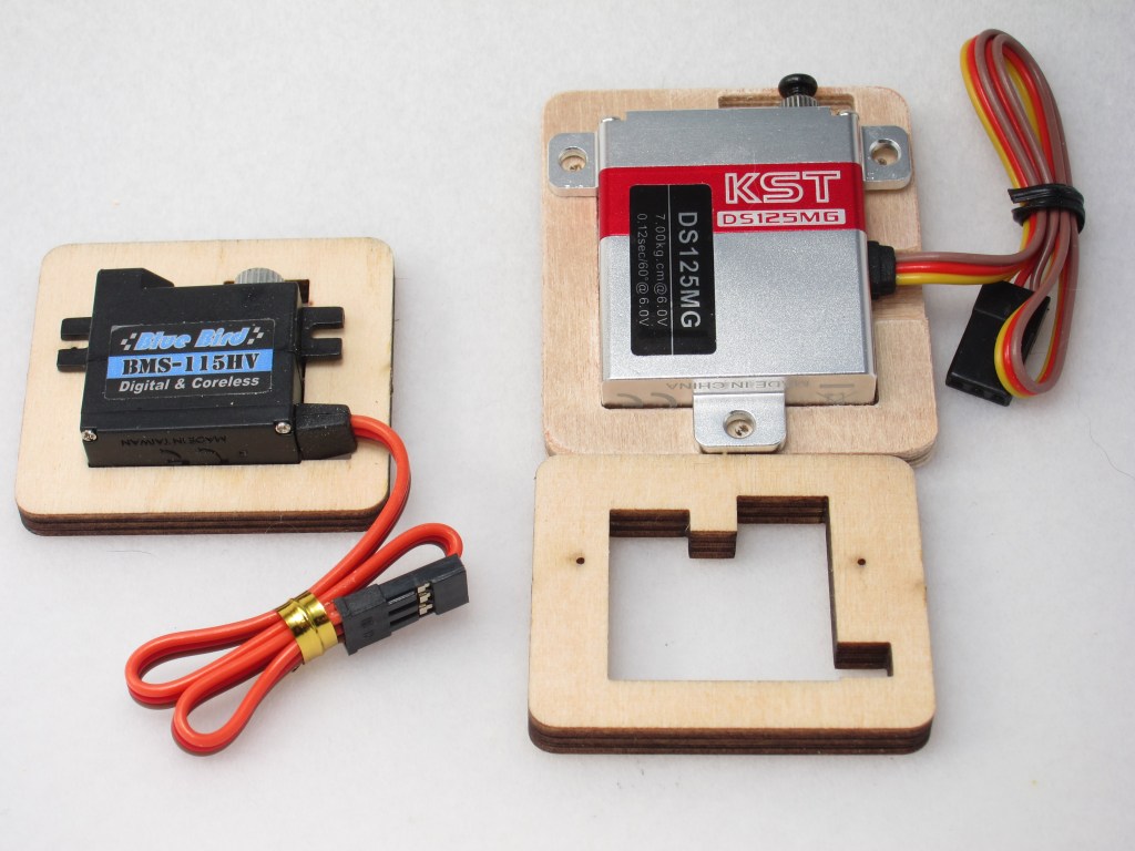 BMS-115HV ウイングサーボ用 サーボベッドを作りました。レーザーカットで筐体がカッチリはまる様に仕上げてあります。厚みは約4.5mm,3枚のべニアを接着して合計9層構造となっており、割れにくくしてあります。裏面でサーボが極わずか浮く厚みがあるためベッドを翼のカーブに合わせて削る余地があります。単体重さ2.7g(ロットにより多少差がでます)。このサーボは固定耳が2か所しか無く、その耳もあまり丈夫でないのでサーボベッドにカッチリはめてケース全体で力を受けられる様にしました。本体外形サイズは41x36mmです。あえて少し外形を大きめにしているのは理由があります。シャーレ翼にサーボを固定した場合いくらガタを少なくリンケージしても力がかかった場合表皮自体が波打って動いてしまいます。小さなサーボで受け面が小さいと、翼のゆがみが起きやすくなるので少し広い面でサーボを受ける様にした方が良いからです。とは言っても、一般的なKST-DS125サイズ用と比較すれば随分小さくなります。3枚9層構造とレーザーカットのためちょっとコスト高です。サーボがはみ出ない厚みがあり9層構造のためネジで割れる事も少ないと思われます。ロッドやサーボホーンに当たる部分は適宜削ってご使用ください。稀にべニアの接着が甘い部分がある可能性があります。その場合は木口に瞬間を染み込ませてやってください。