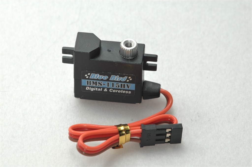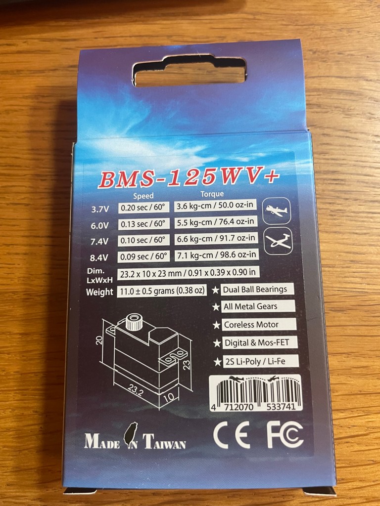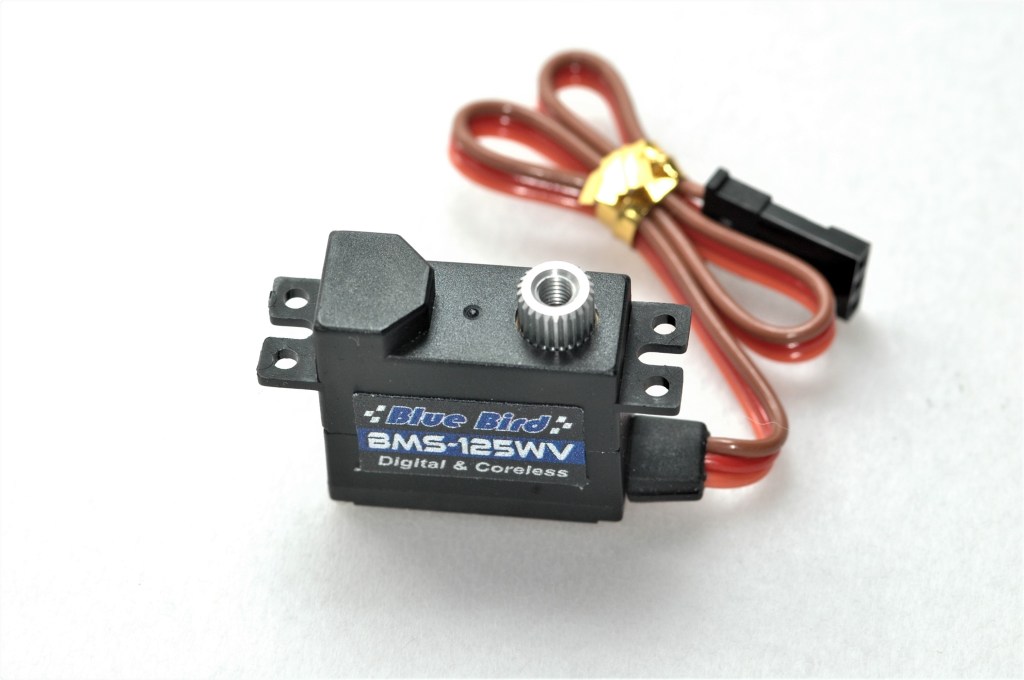 ブルーバード社の高価格サーボには結局あまり注文が無く、現在円安でもありリーズナブルなウイングサーボの115WV+と、尾翼用の125WV+にラインナップを絞っています。金属ケースのサーボも入荷はしてみましたが、価格、ギアのバックラッシュの精度、汎用性など考慮すると高価格帯サーボは結局ポピュラーなK社Xシリーズと比較して明確なアドバンテージは無い様に思います。 WV+シリーズは従来の115HV、125WVとケースは同一です。115HV用のサーボベッドはそのまま使用可能です。作動保証電圧が3.7V-8.4Vのワイドボルテージ対応となりました。5V出力のBECでも使用可能です。7.4V時静止トルク6.6Kg-cm、8.4V時トルク7.1Kg-cmと10%程トルクアップしています。最近の円安とモデルチェンジのため115HVより若干値上げです。