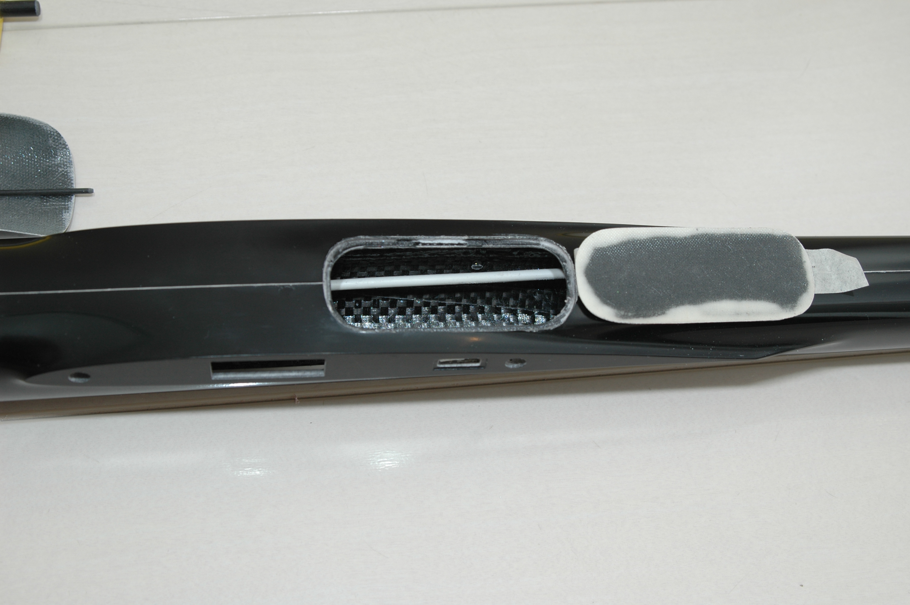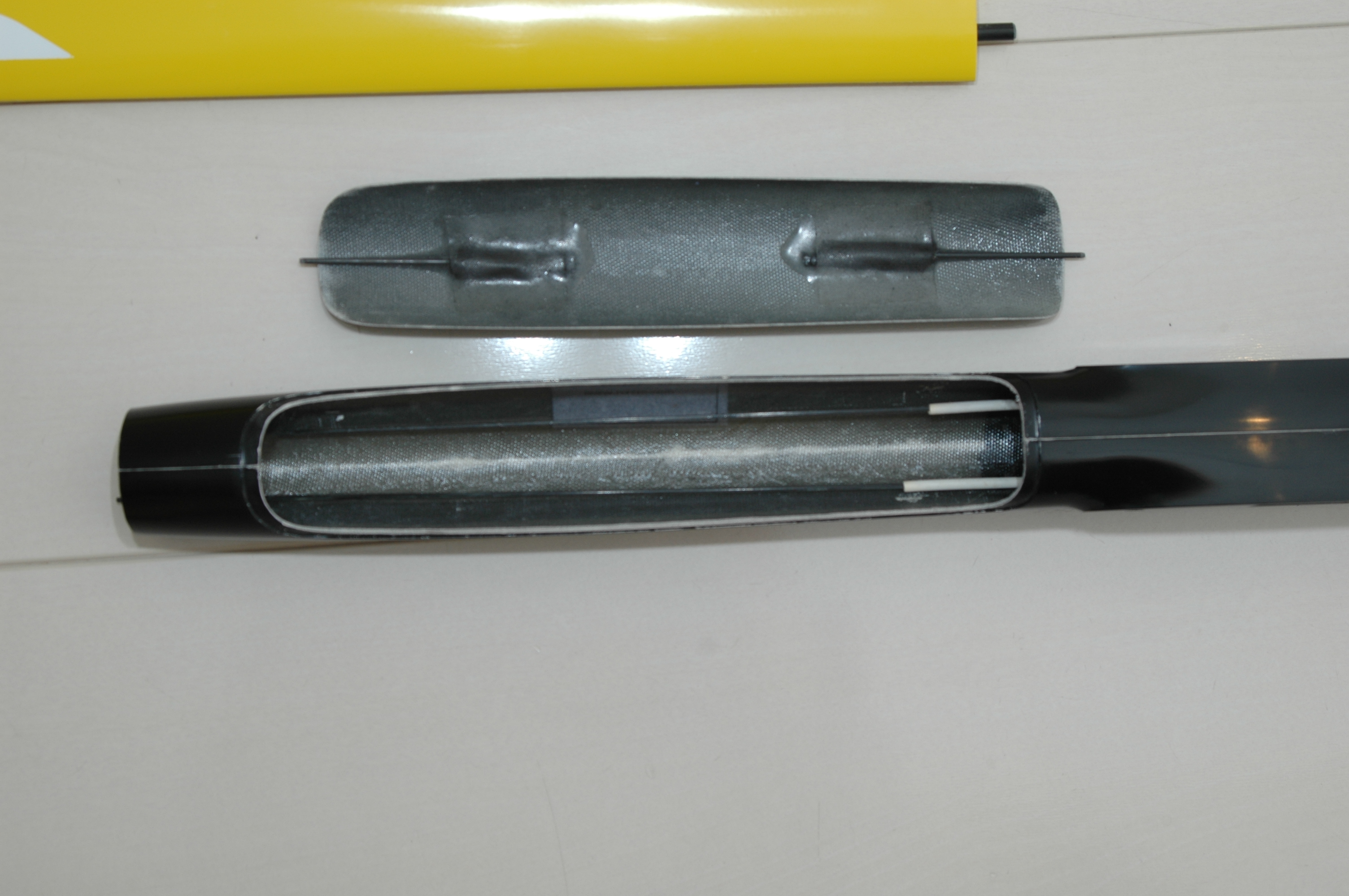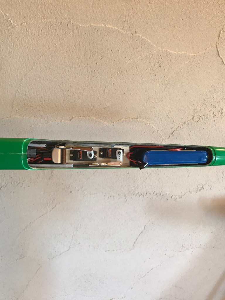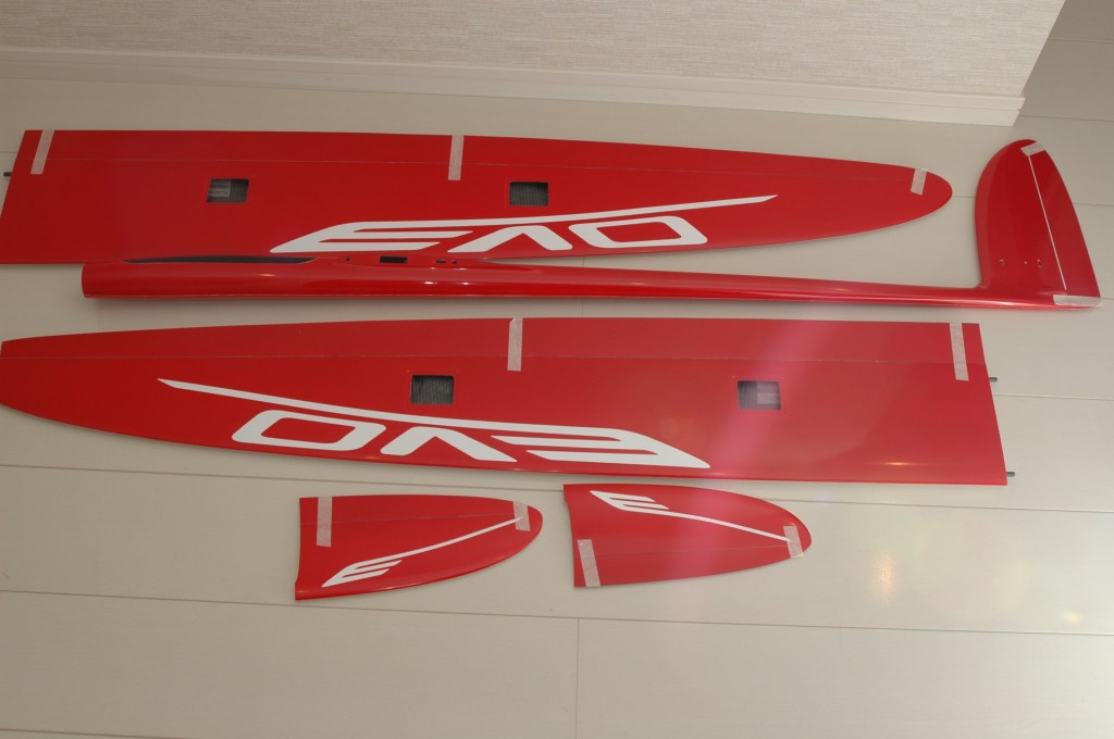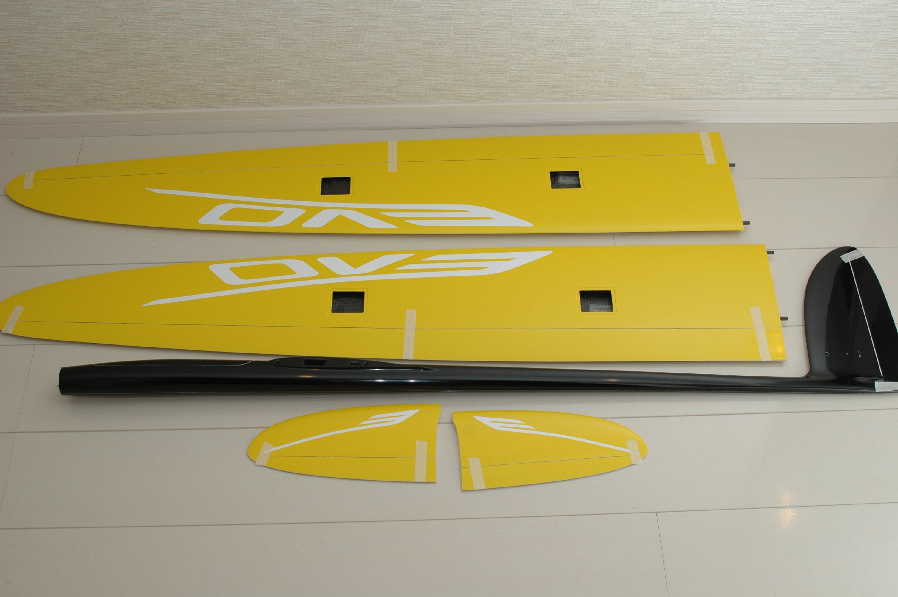 メカの搭載は、機首からバッテリー、サーボ、受信機として、受信機は主翼間の胴体に入れました。アンテナはあらかじめ胴体の底のカーボンロービングから外れた部分にノイズレスパイプを接着し、1本はこれに通しもう一本は縦にサーボボードを貫いたノイズレスパイプに通します。サーボボードの後ろにフタバ一軸ジャイロをマウントしています。こうすると付属のバラストチューブが使えなくなります。しかしevoではカンザシボックスの後ろに片翼10x20x150mmサイズのバラストチャンバーが付きました。真鍮をつかうとフルバラストで500g弱載せられますので主翼負荷の増える胴体にわざわざバラストを載せる必要はもう無い様に思います。5x20mmの板か、10×10の角棒でバラストを作るのが良いと思います。