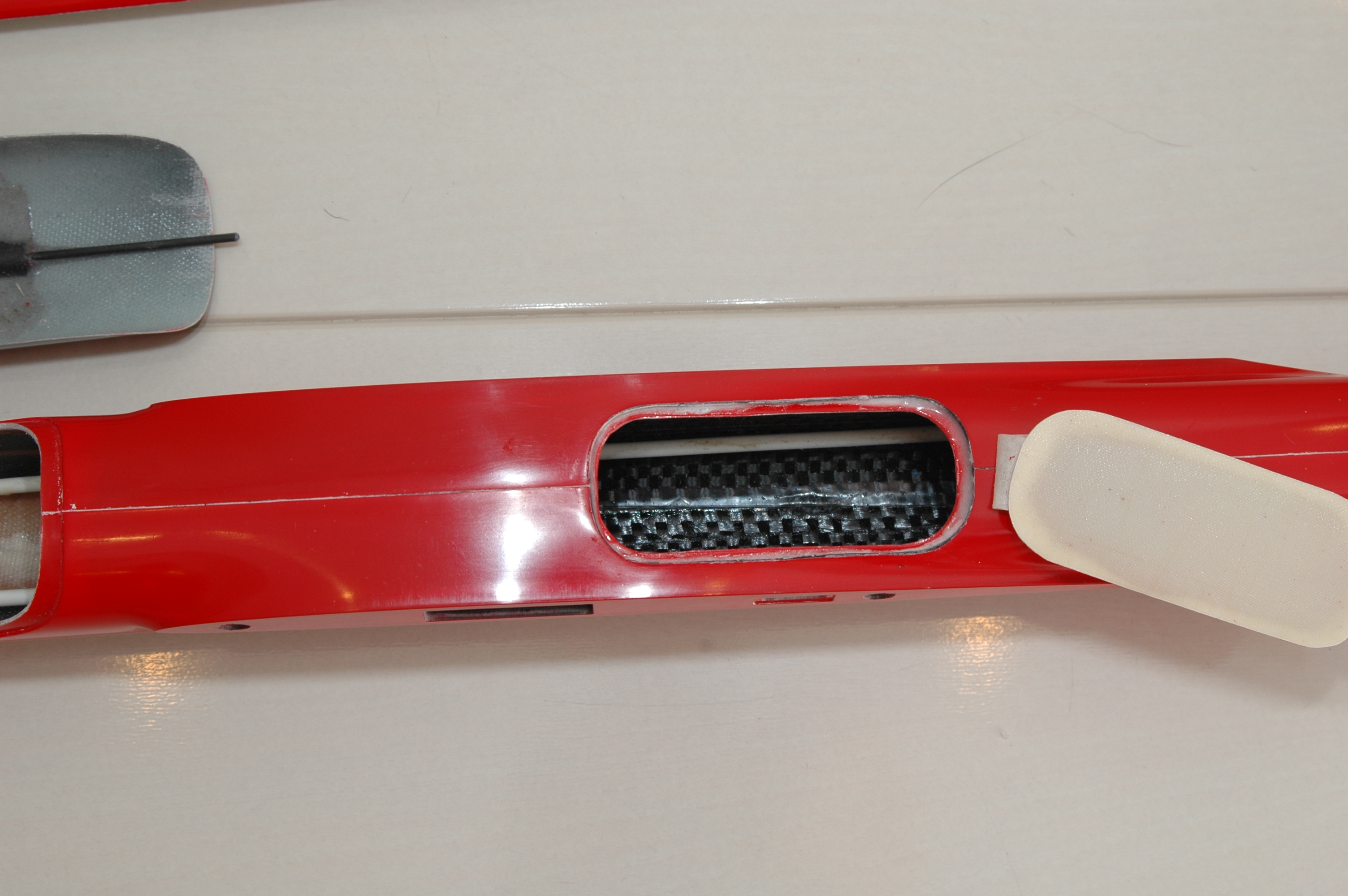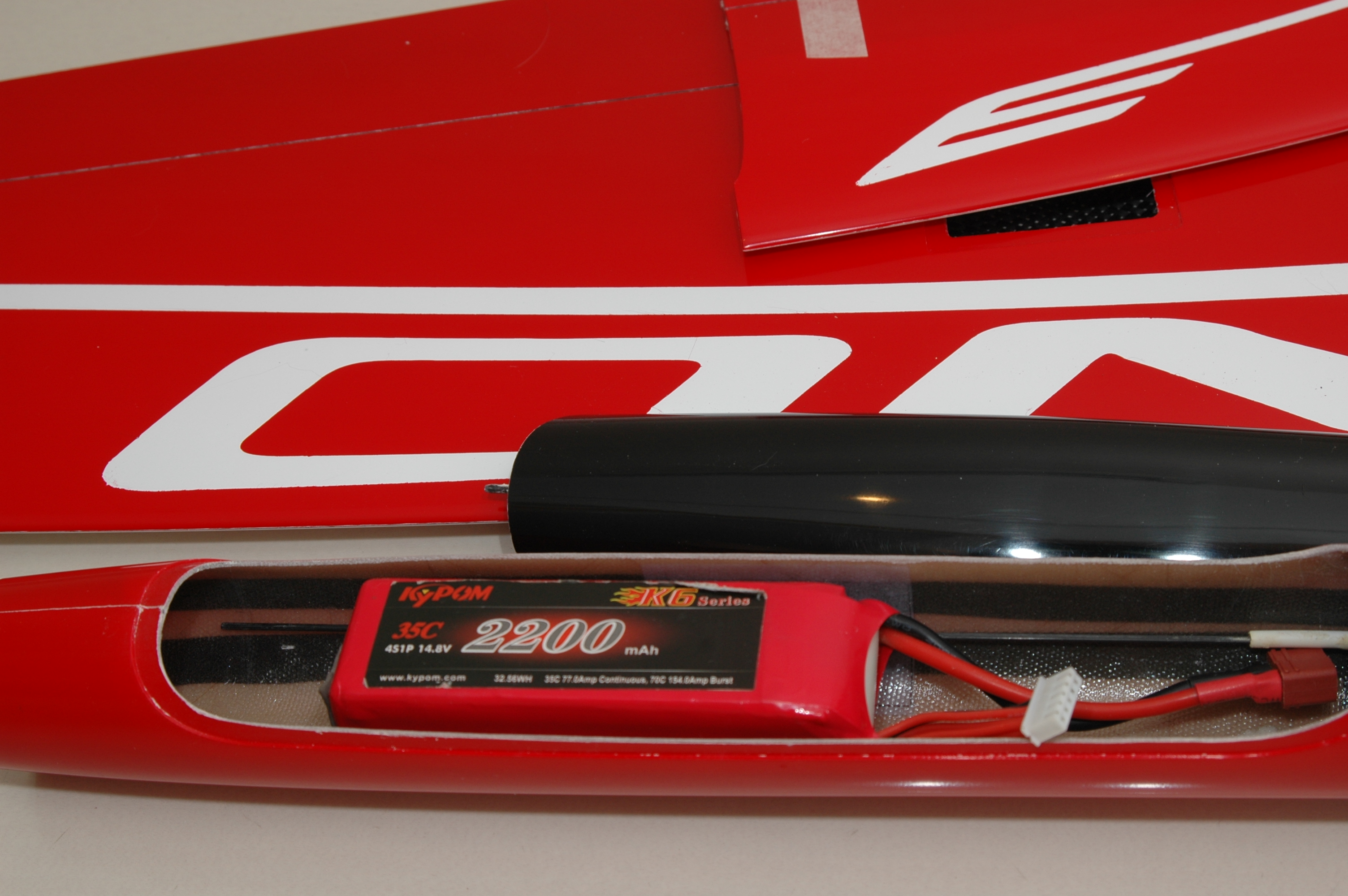 胴体が、E-Jarvisと比べても一回り太くなっています。さらに主翼間にハッチがありここにサーボを詰めば受信機をカンザシの前に入れて、写真の様に4Cell 2200mAhが余裕で入るので80A級のアンプをその後ろに積む事も可能になります。5Cellでも詰めますね。主翼取り付け部~テールにKevlar層を追加してあるので重心合わせのためにも大き目のバッテリーで丁度良いと思います。胴体の余裕を生かして、最初からハッチ~ノーズもKevlarかグラスを貼り込んで補強するのも良いかもしれません。厚手のKevlarなどで補強した場合、いくらカーボン層は無いとしてもアンテナは外に出した方が無難と思います。